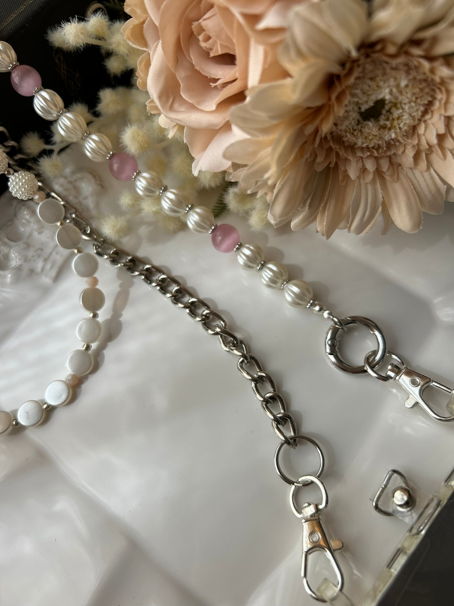 着けるだけ!おしゃれが叶う!            ☆ジュエリースマホストラップ☆          【3way・シルバー・パール】             ストラップホルダー・お手入れクロス付